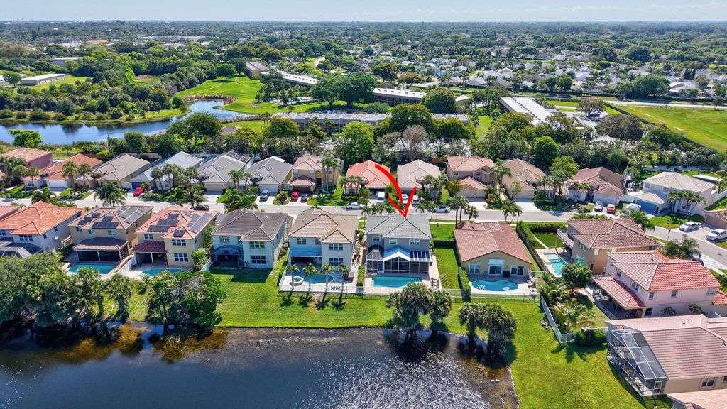 Welcome to this beautifully updated 2 story, 4 bedroom, 2.5 bathroom lakefront pool home located in Nautica Sound in Boynton Beach. This move in ready property features a saltwater pool, modern upgrades, and seamless indoor outdoor living, making it ideal for enjoying the South Florida lifestyle. The home offers outstanding curb appeal with lush tropical landscaping, mature palm trees, an oversized driveway, and a two car garage. A peaceful rock waterfall feature enhances the front entry, leading into a bright foyer with a grand staircase and elegant architectural details. This property is equipped with full impact windows and doors, a 2024 roof, plantation shutters throughout, and recessed lighting that provides a clean and modern look. Smart home features include app controlled lighting and entry access, offering added convenience and peace of mind while away. The exterior is also outfitted with security cameras that will remain with the home, providing additional safety and value. This open concept floor plan is ideal for both entertaining and everyday living. The spacious great room features large format tile flooring, crown molding, and abundant natural light. Upon entry, you are welcomed by a formal dining room and family room. The formal dining room features impact French doors that open to a screened patio with beautiful views of the pool and lake. The fully renovated gourmet kitchen is the centerpiece of the home, designed with white cabinetry, quartz countertops, stainless steel appliances, and a modern subway tile backsplash. The kitchen also includes a breakfast bar overlooking the living areas and water views, along with custom pull out cabinetry and a separate pantry with built in pull outs for maximum storage and convenience. Adjacent to the kitchen is a bright breakfast nook with plantation shutters, as well as an oversized living area with French doors leading to the screened patio, creating a perfect flow for indoor outdoor entertaining. Step outside to a private backyard retreat featuring a fenced in saltwater pool, expansive paver deck, and covered lanai perfect for year round enjoyment. The fenced yard provides privacy while showcasing stunning lakefront views, making this an ideal space for entertaining, relaxing, or enjoying the South Florida lifestyle. Upstairs, the primary suite offers a spacious retreat with hardwood flooring, tray ceilings, crown molding, and natural light. The primary bathroom features a soaking tub, a large frameless glass shower with marble style tile, dual vanities with quartz countertops, and modern finishes. The 3 additional bedrooms are generously sized with hardwood flooring, plantation shutters, and ample closet space. The renovated guest bathroom includes a double vanity, quartz countertops, designer tile flooring, and a glass enclosed shower. Additional features include a modern laundry room with your washer and dry and ample storage space, along with a convenient 1st floor half bathroom for guests. Nautica Sound is a highly desirable guard gated community of single family homes located in the heart of Boynton Beach, offering security, convenience, and the best of the South Florida lifestyle. Residents benefit from 24 hour manned security and beautifully maintained surroundings featuring lush tropical landscaping, scenic lakes, and well kept homes that create strong curb appeal throughout the neighborhood. Enjoy access to a clubhouse, large swimming pool, fitness center, tennis courts, pickleball courts, basketball court, playground, picnic areas, and sand volleyball. Ideally located, Nautica Sound is just minutes from everyday conveniences including Publix, Walmart Supercenter, and the Boynton Beach Mall, along with a variety of shopping plazas and retail options. Dining and nightlife are easily accessible throughout Boynton Beach and nearby Delray Beach, including Atlantic Avenue, known for its restaurants, bars, and vibrant atmosphere. For outdoor recreation, residents