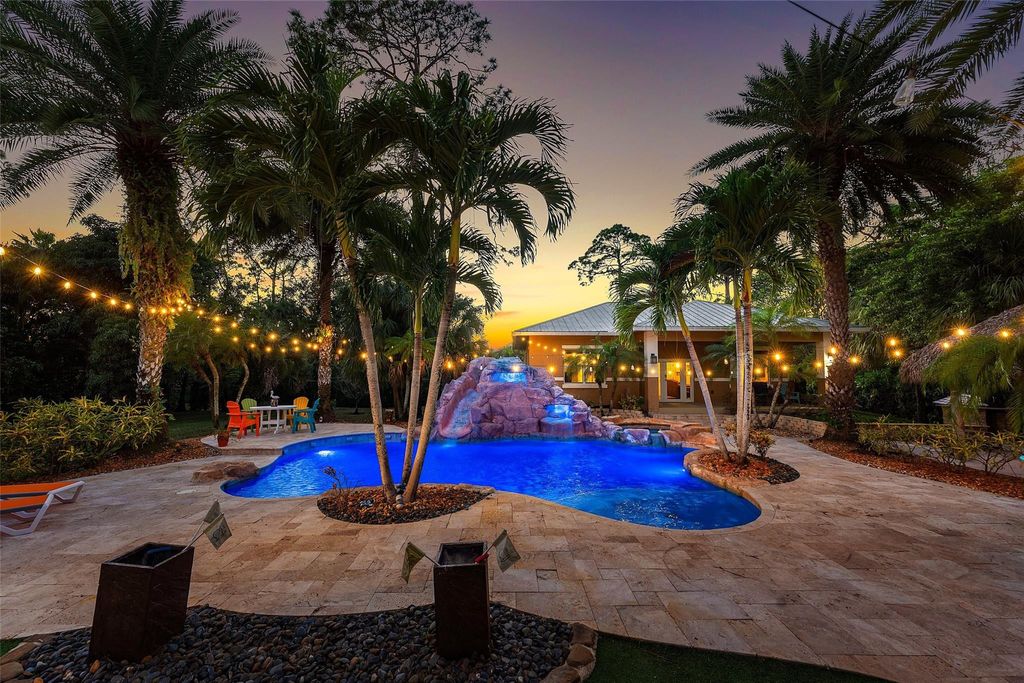 Impressive family compound with a guest house set on 1.09 acres, perfect for multi-generation households. Large living areas framed by impact glass create seamless indoor/outdoor flow with tranquil views of the tropical pool & backyard. A striking exterior features a long driveway, manicured lawn, & stunning double-door entry. The open kitchen/family room offers wood cabinetry, top-shelf appliances, a fireplace & generous space. The impressive primary suite boasts a spa-like bath, custom closets, & serene pool views. Enjoy a private backyard retreat with a tiki hut, oversized pool with waterfall & slide, multiple outdoor living spaces & when the sun goes down the magic begins. Fabulous guest house with a front porch, great room, full kitchen & bath"”ideal for guests or in-laws.