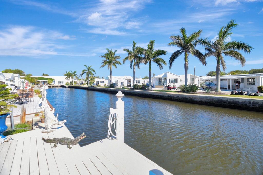Fantastic Briny Breezes canal front home with views of the intracoastal, magical sunsets and all that Briny has to offer. Spacious 2/2 w/vaulted ceilings, expansive open floorplan, lots of windows, tastefully decorated and move in ready. Newer AC, tankless hot water heater and hall bath recently re-done. Full deck and dock, marble pavers and artificial turf, electric roll out awning for shaded dining and so much more. Only 3 units from intracoastal with forever views. Briny Breezes has something for everyone with Oceanfront Clubhouse, stunning private beach, endless intracoastal frontage, with parks, picnic areas, clubs and non-stop activities. There is something for everyone at Briny. Minutes to great restaurants, stores and a quick ride to the airport too. 46 shares in Co-Op.