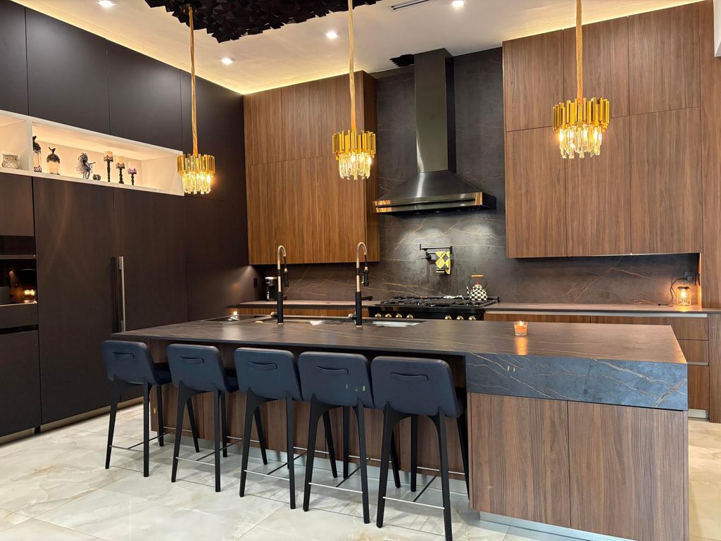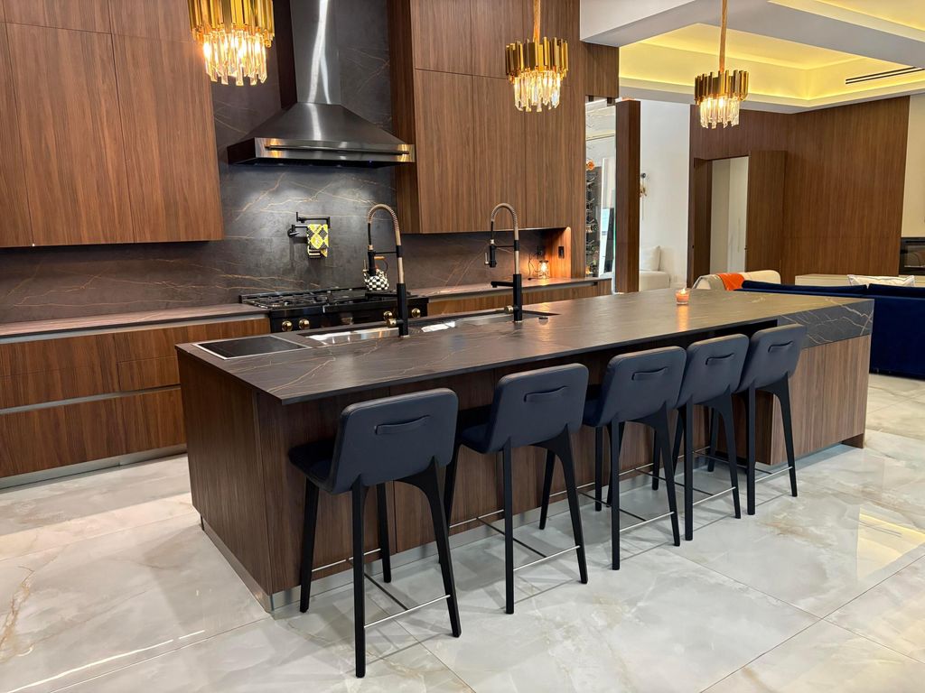 Welcome to a masterpiece of modern elegance set on a coveted double lakefront lot in Parkland's premier community. A dramatic 34-foot entryway with soaring ceilings, sculpted pillars, soffit detailing, and Restoration Hardware chandeliers creates a breathtaking first impression. The interiors are defined by 48x48 Crystala marble flooring, ambient designer lighting, Azori cabinetry, walnut leather wall panels, and striking Dekton countertops, blending warmth and contemporary sophistication. The gourmet kitchen flows effortlessly into expansive living spaces designed for both grand entertaining and intimate gatherings. A versatile front office with a private bath can serve as a guest suite. The primary suite on the main level is a serene retreat, featuring a spa-inspired bath with black marble tile, soaking tub, walk-in shower, and an oversized dressing room. Upstairs, two ensuite bedrooms open to private balconies with tranquil lake views, complemented by a loft overlooking the elegant living areas below. Outdoors, experience true resort living in the oversized backyard oasis, showcasing a spectacular pool, jacuzzi, and lounge areas framed by tropical landscaping and architectural hardscape design. Additional features include a 3-car air-conditioned garage, 2022 Trane HVAC, impact glass, 2017 roof, linear vents, and tiled columns. This exceptional residence embodies timeless luxury and sophisticated design at every turn.