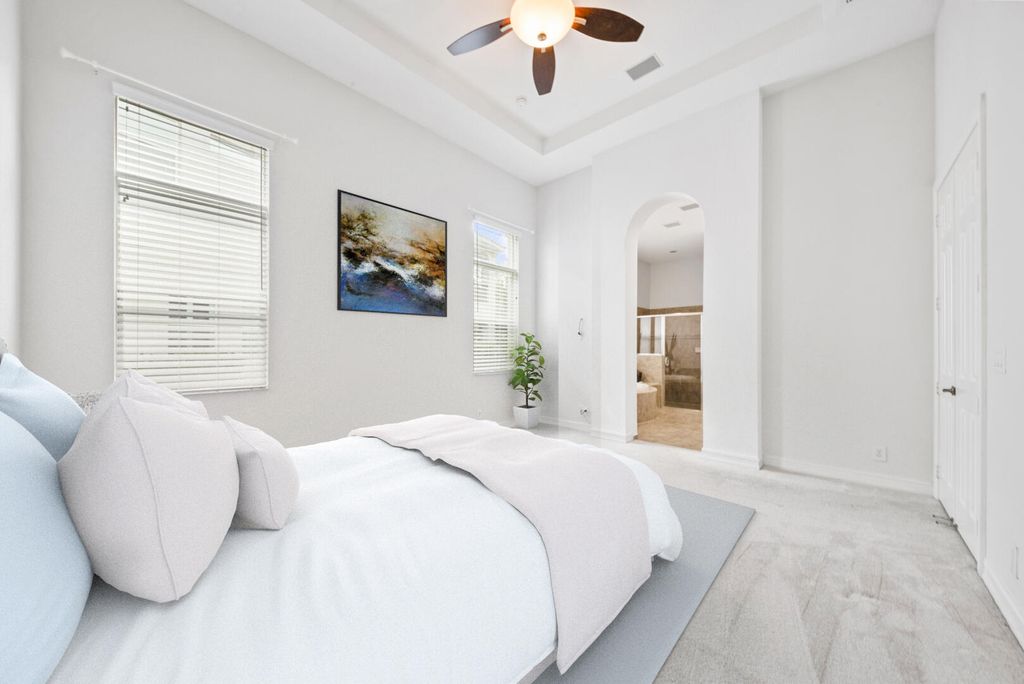Charming 4 bedroom, 3 bath home boasting a grand foyer leading to a spacious great room and a stylish formal dining area illuminated by transom windows. Enjoy surround sound throughout and ample natural light accentuating the interior. The dream kitchen features pristine white cabinets, granite countertops with matching backsplash, stainless steel appliances, a convenient pantry, and a sleek snack bar for casual dining. The primary suite offers luxury with its double door entrance, tray ceiling, and a custom walk-in closet for organization. Pamper yourself in the ensuite bathroom complete with dual vanities, a relaxing jetted tub, and a separate walk-in shower.