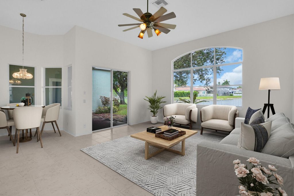Step into this rare 4-bedroom, 2.5-bathroom home located in the sought after gated community of The Shores at Boca Raton. Situated on one of the best waterfront lots in the community with long lake views, this home offers a rare sense of privacy. Brand new roof installed in 2025! Curb appeal sets the tone with fresh landscaping and a freshly painted exterior inviting you inside to a thoughtfully designed floor plan filled with natural light.Throughout the home, beautiful laminate and tile flooring create a warm, low-maintenance atmosphere. The oversized living room offers 12 foot ceilings and plenty of seating room perfect for soaking in the stunning lake view.